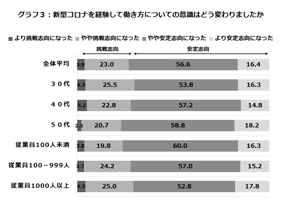 世間を見ると、コロナを利用して変わろう、とポジティブに考えている人もいますが、アンケートを取ってみると、一般的にはコロナによって「安定志向が高まった」という人がすごく多いんです。