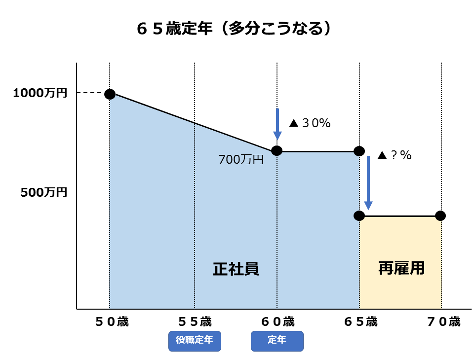最悪の場合、将来的には解雇条件の緩和などを言い出す可能性もありますし、50歳ごろから給与を下げられる可能性もあります。