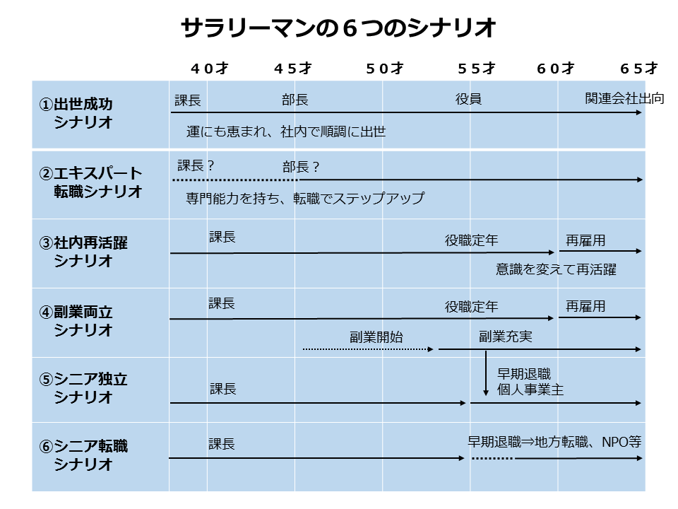 6つのシナリオとは①「社内出世型」、②「エキスパート転職型」、③「社内再活躍型」、④「副業両立型」、⑤「シニア転職型」、⑥「シニア独立型」です。