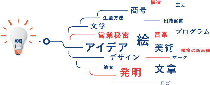 ただ、知的財産と言っても、たとえば新しい技術・アイデアの発明や、物品・建築物から画像のデザインといった意匠、絵画や文章・音楽といった創作的表現である著作物まで、非常に幅広いのが実情です。