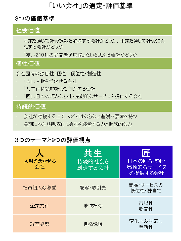 「いい会社」の選定・評価基準としては、「社会価値」「個性価値」「持続的価値」という3つの価値基準があると考えています。