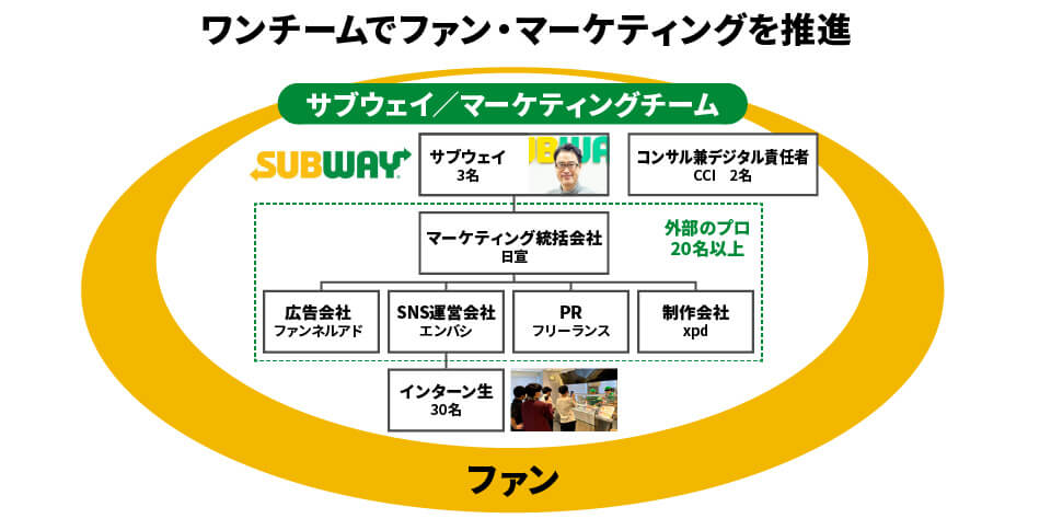 外部プロの積極活用については、サブウェイの管轄を小さくして、責任代理店の日宣をトップに、たくさんのいろんな協力会社がぶら下がる体制にしました。また、CCIさんには相談役的な立場として、たとえばどちらの方向に行くべきかなどのアドバイスをもらったりしています。