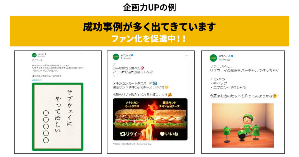 ペルソナの話でも少し触れましたが、サブウェイにはファン重視が機能しやすい土壌があったので、口コミが非常に効くことはわかっていました。そこでSNSを中心に、ファン化に真剣に取り組もうと考えました。そのためには、コメントに返信するアクティブサポートと企画のコンビネーションでファンとの接触機会を増やすことが大事だと思いました。