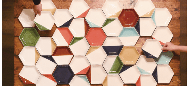この “掛け分け”の技法を使って六角形の器の一部だけに色釉薬をかけることで、これまでありそうでなかった「組み合わせ自由」で「繋がる」プロダクトを生み出すことができました。