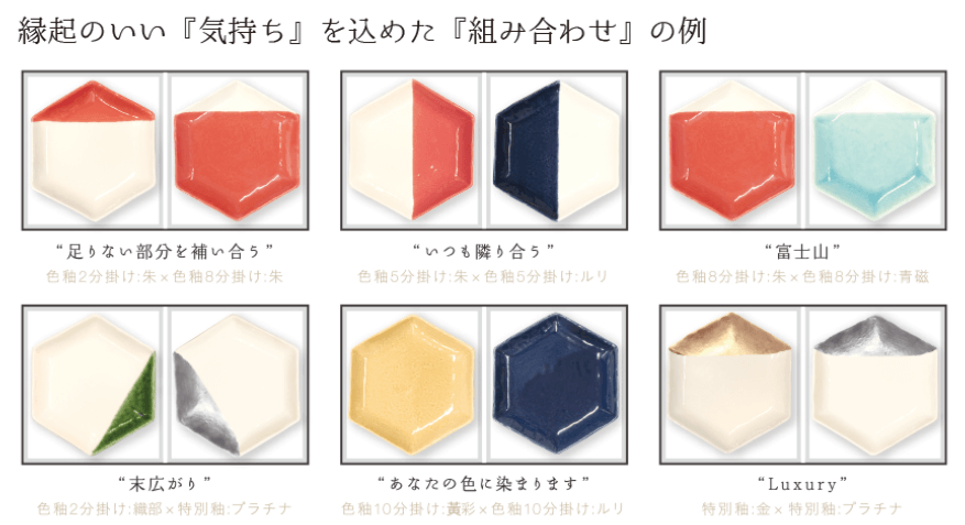たとえば、「朱の色釉2分掛け」と「朱の色釉8分掛け」を2枚セットにすることで「足りない部分を補い合う」という思いを表しています。
