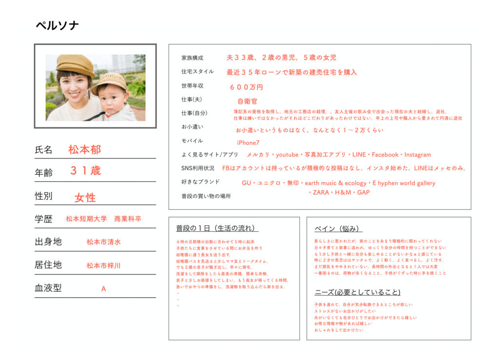 ペルソナは、夫と2人の子どもがいる松本市在住の31歳の女性としました。日々子育てと家事に追われてゆっくりとした自分の時間が持てない……という悩みを持ち、「子どもを連れて気分転換できる場所がほしい」「ストレスがないお出かけがしたい」というニーズを持っている女性です。