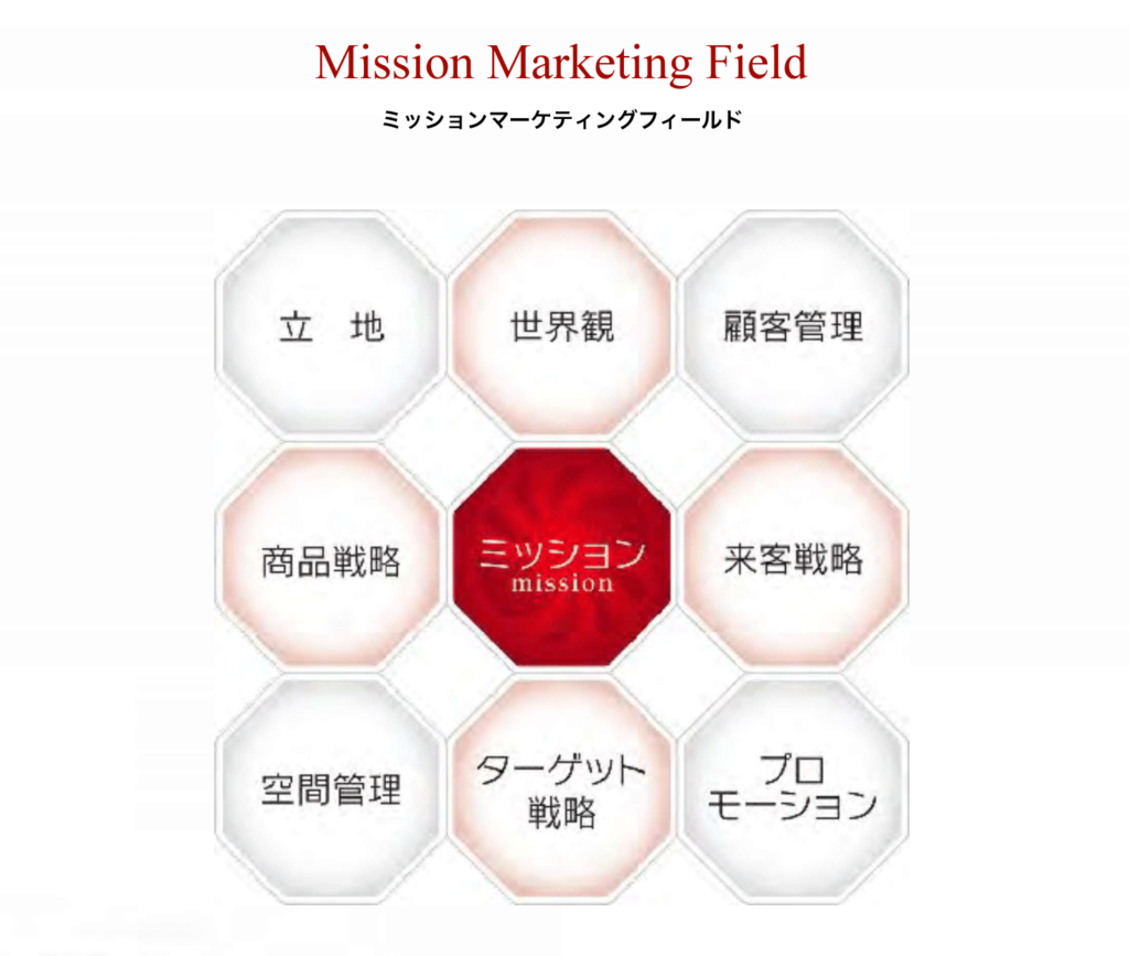 そこで、中小企業向けに、簡単に商品やサービスを改善できるように考えたのがこのフォーマットです。「ミッションマーケティングフィールド」と呼んでいるもので、中心には必ずミッションがあります。ミッションを中心に全体を最適化することで商品やサービスを改善していこう、ということですね。