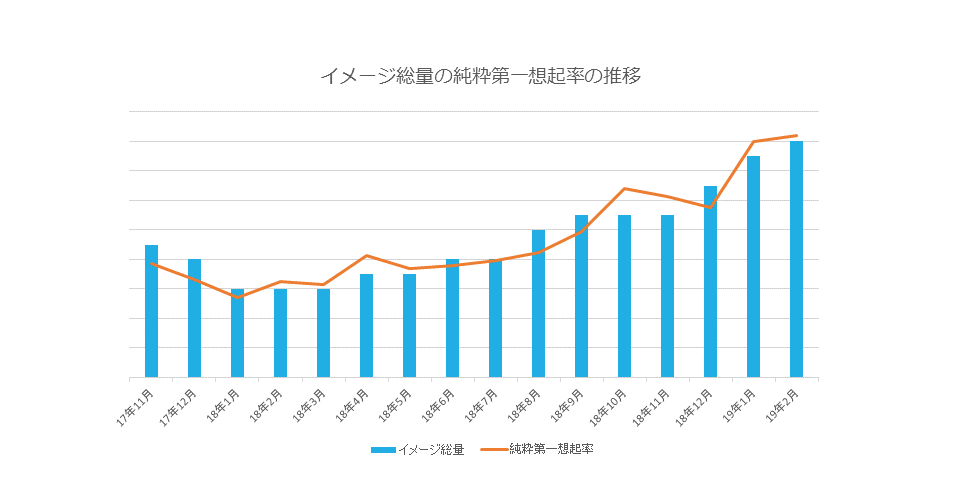 2つめは、「ブランディングによるイメージ総量の蓄積は、純粋第一想起率の伸長につながるか?」ということでした。これも、完璧にグラフが相関しています。