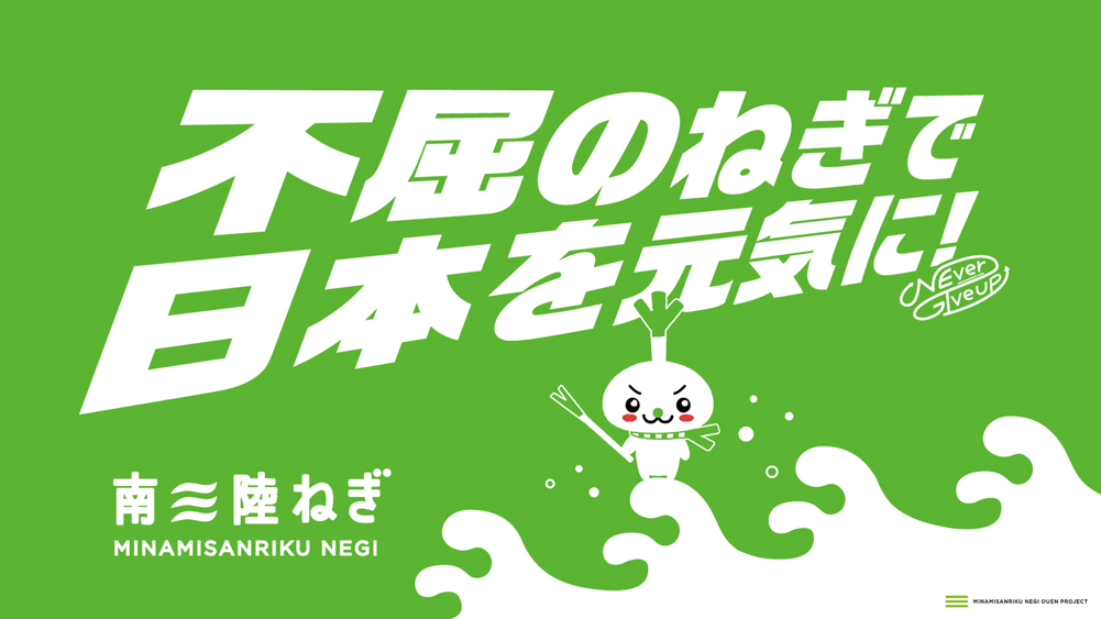 また、ブランドのキャラクターも作成しました。「みなさんで作るねぎ」なので、公募という形を選びました。不屈というキーワードは、英語でいうと「NEVER GIVE UP」。そこから、キャラクター名が「ネギプー」と決まったんです。ネギプーは農協とのコラボポスターにも描かれたり、農家さん募集のチラシにも使われております。