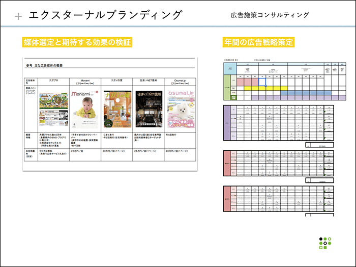 中部建設工業様においては、ブランディング構築後、VI、サイトのリニューアル、パンフレット・名刺のリニューアル、広告戦略(どの時期に、どの媒体で、どんな原稿で、どのくらいの予算で、どう効果測定して、次に活かすか)と、イベント設計(どのイベントで、どんなブース作りをして、どんなツールで、注意点は何で、どんなオペレーションで)までお手伝いさせていただきました。
