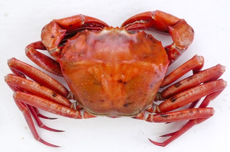 甲が赤いのが特徴(若いうちだけ。大きくなると黒くなっていく)で、深海500~800ⅿに生息し、エサも豊富であまり動くことがないため、比較的浅瀬に生息する一般的なカニより、非常に身入りがよく、甘み旨みも抜群です。加熱しても味が残ることから、幅広い料理に使用されています。さらに、栄養価が高く、イソロイシンなど体で作ることのできない必須アミノ酸やプロリンなど旨みに優れたアミノ酸が高い数値を示しています。