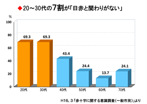 「もっとクロス!計画」を始める前の2004年に、一般の方たちに日赤の認知度に関するアンケートを行ったところ、「日赤のことをあまりよく知らない」「自分とは直接関わりがない」という回答が、20代、30代を中心に多く寄せられました。このことは、私たちにとって大変大きなショックでした。