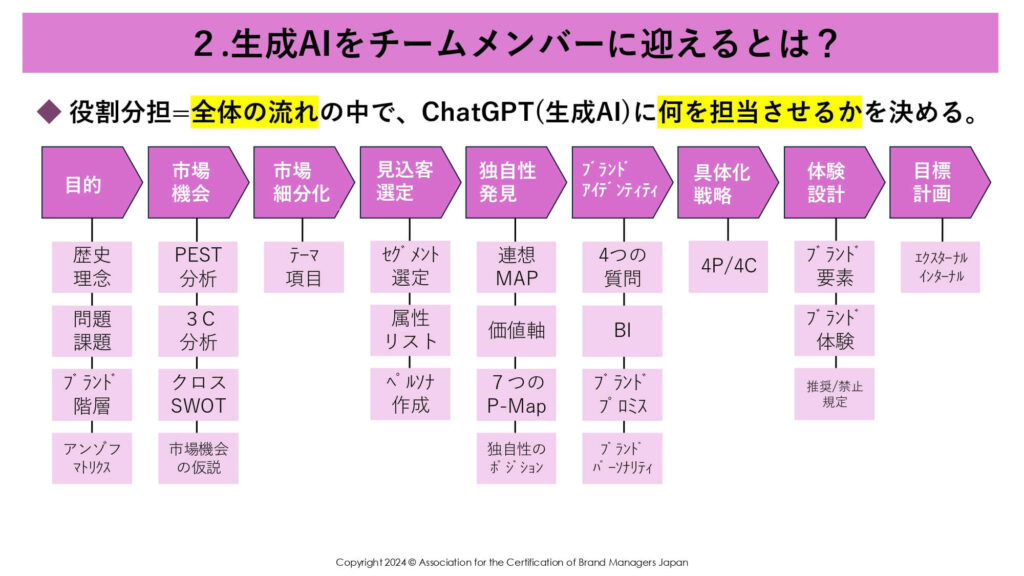 「チームメンバーに迎える」というのは、全体の流れの中でChatGPT、生成AIに何を担当させるかを決めていく、という意味で、たとえば「ブランド構築ステップ」をワークフローのように分解するとステップごとに実践する内容が分けられますが、このステップの中でChatGPTに何を担当してもらうかを決めるのが「チームメンバーに迎える」ということなんです。