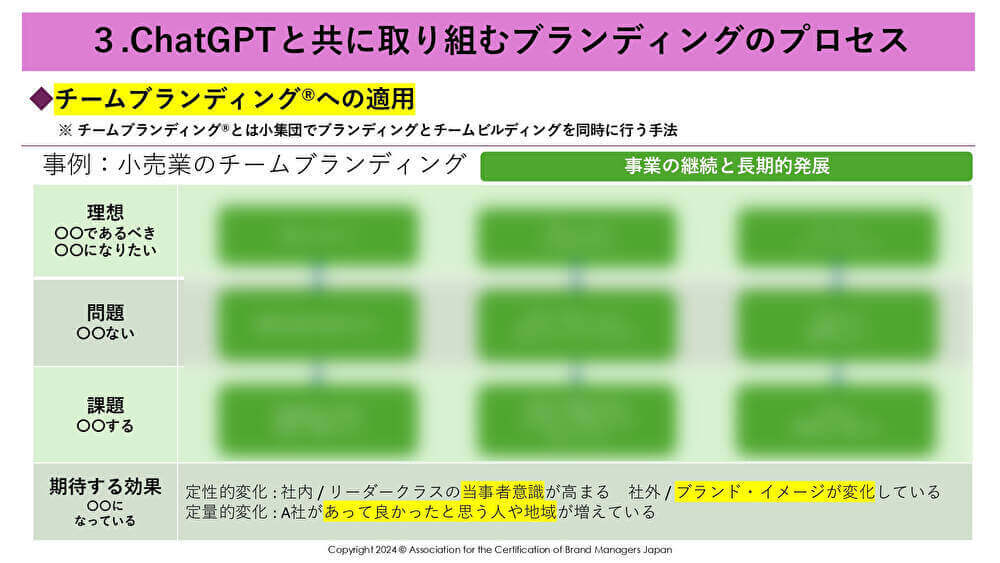 ちなみに「チームブランディング」は協会の造語で、小集団でブランディングとチームビルディングを同時に行う手法ということを指します。