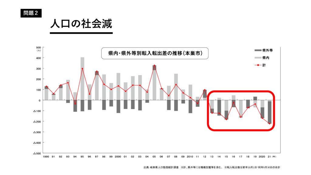 ただ市の人口はというと、2013年から転出超過となり、減少し始めていました。