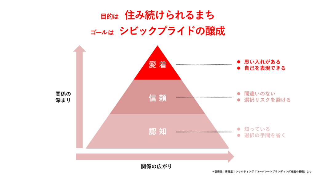 そこで、ブランディングをスタートした時点では「移住・定住人口の増加」と「外から人を呼び込む」ことをゴールに設定していましたが、目指すゴールを「シビックプライドの醸成」に変更しました。