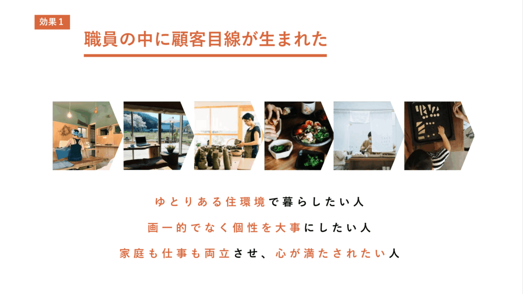 1つ目は、本巣市役所の職員の中に「年代、年齢、性別を問わず、こういう価値観を持った人に住んでいただきたい」「こういう人たちが住み良い街にするにはどうすべきか」「この価値観を持つ人に刺さるように」という顧客目線が生まれたことです。