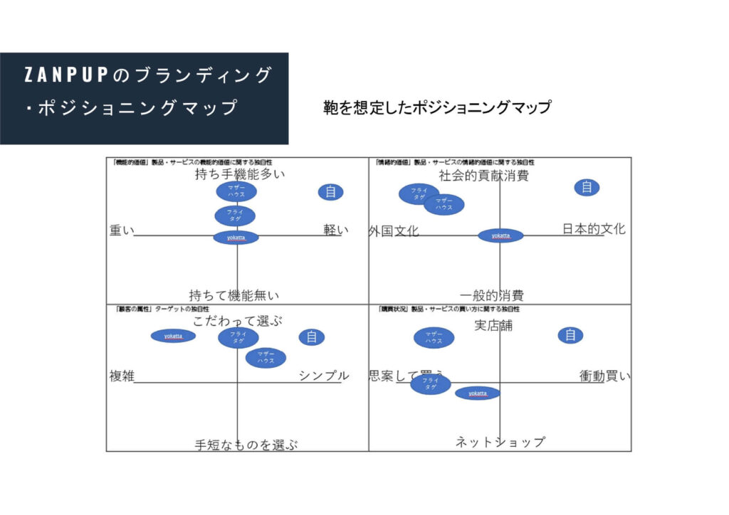そして、バッグを製品に想定したポジショニングマップを作成し、他社との差別化ポイントや自社独自の強みなどを把握し、競合に勝てる商品になる可能性を感じることができました。